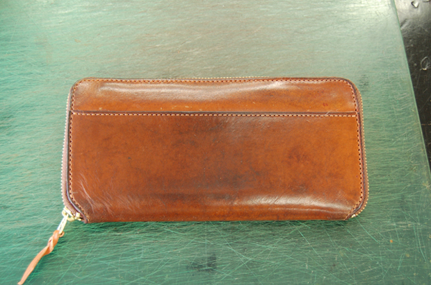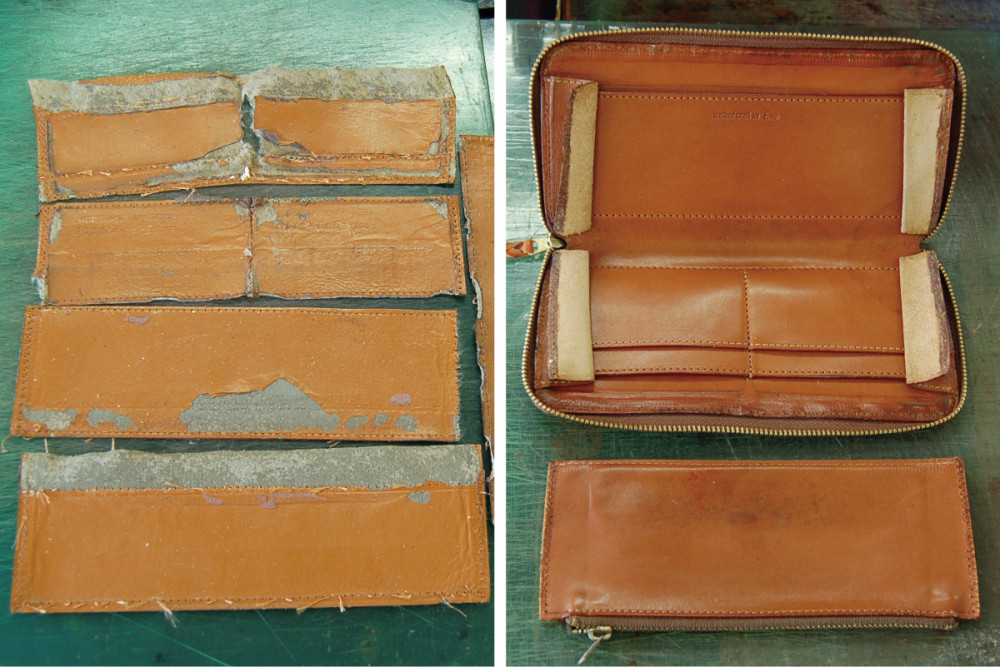 こちらのお財布は20年以上ご愛用いただいている品で、ファスナーに不具合が生じたため、修理に持ち込まれました。同時に内装の合成皮革を革に貼り替える修理も行いました。