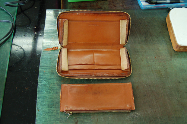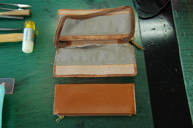 今回は、いたがきの中でも変わらず人気の長財布《E155(現E175)プレイング束入れ》のファスナー交換と、内装を合皮から革へ交換する修理の様子をご紹介します。