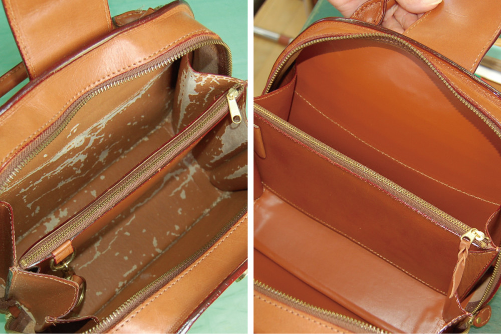 外側の革はとても綺麗な状態ですが、内装の合皮が劣化し表面が剥がれてしまっています。