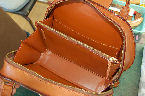 新しい革を貼る前には、できる限り鞄の形を整えてから、シワにならないように注意しながら、曲線に合わせて貼り合わせていきます。