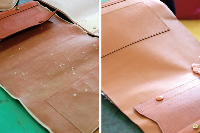 発売から約30年、今でも多くの方にご愛用いただいているこの鞄ですが、当時使用していた内装材は経年で剥がれてしまうことがあるため、革に交換する修理をお勧めしています。