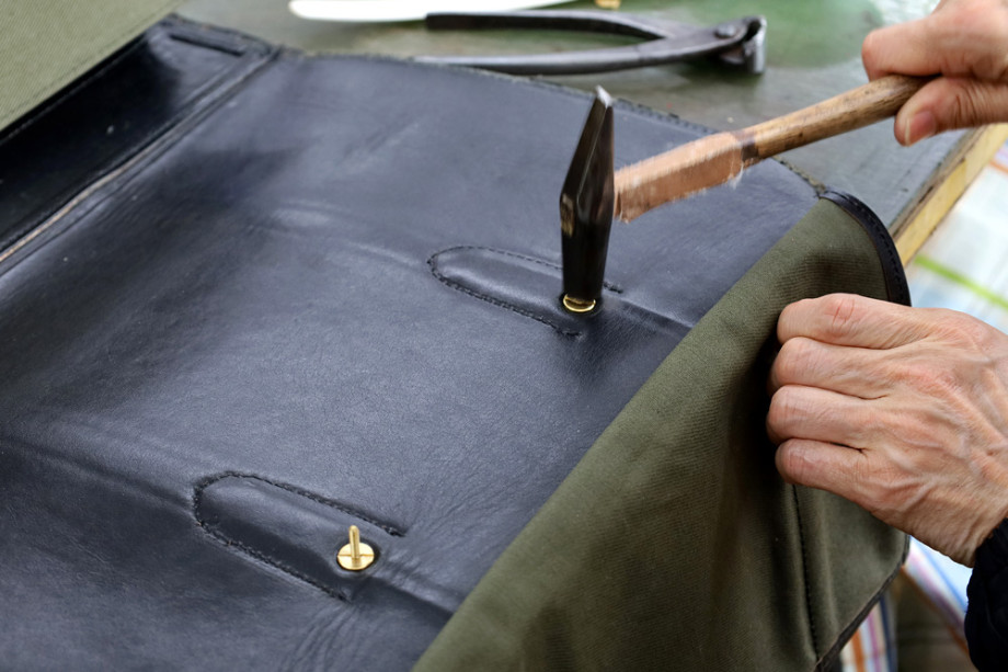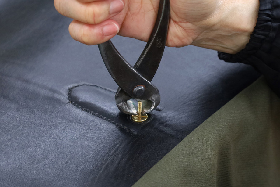 根革の金具はネジ式で、内装側から飛び出した部分を切断し、金槌で叩き潰して固定します。「からくり」と呼ばれる、とても頑丈な固定方法です。