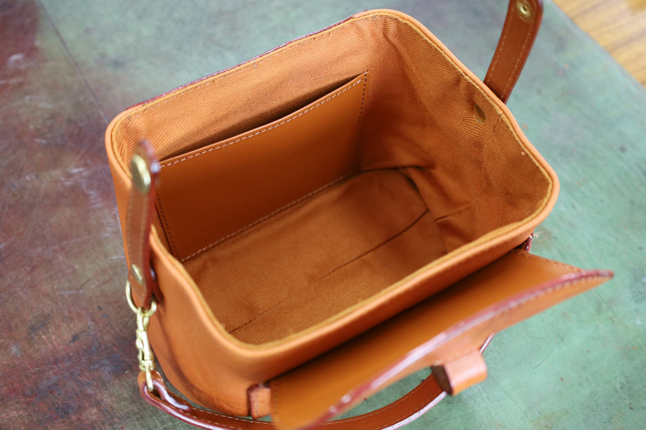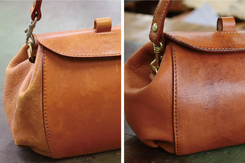 新しいソフト革の横マチと、先ほどのかぶせのパーツを縫い合わせ、底マチや内装地も縫い合わせていくと、再び鞄の形が組み上がりました。新調したハンドルなどのパーツなども合わせ、全体的にお手入れを施して、修理完了です。