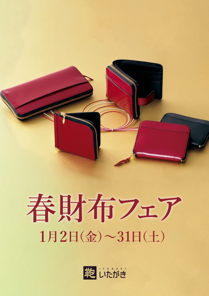 春に使い始めるお財布は縁起が良く、たくさんお金が貯まって”張る”財布になるといいます。鞄いたがき直営店とオンラインショップでは、今年も1月31日(土)まで「春財布フェア」を開催いたします。